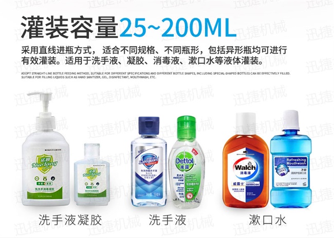 全自動(dòng)凝膠生產(chǎn)線適用于消毒凝膠、免洗手洗手液、免洗手消毒凝膠、消毒液、84消毒液、醫(yī)用酒精、75%酒精消毒液、75度酒精、消毒水、殺菌消毒劑、醫(yī)用酒精、碘酒、次氯酸鈉、劑、醫(yī)用乙醇消毒液、瓶裝消毒劑等產(chǎn)品,有多頭全自動(dòng)消毒液灌裝機(jī)和封箱機(jī)、貼標(biāo)機(jī)、打包機(jī)、噴碼機(jī)等配套設(shè)備組成,實(shí)現(xiàn)消毒液自動(dòng)灌裝,自動(dòng)旋蓋,自動(dòng)貼標(biāo),從灌裝、到成品的全部過(guò)程
