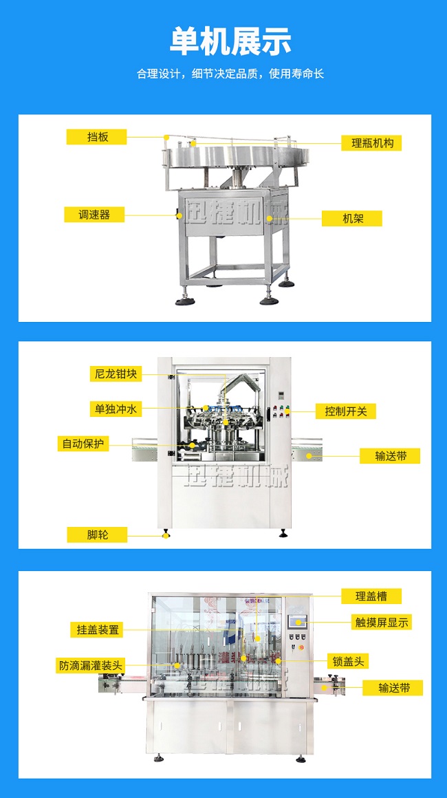 本灌裝流水線設(shè)備具有穩(wěn)定可靠、自動化水平高,相比同類產(chǎn)品有著更長的使用年限,維護簡單,整線中各設(shè)備的協(xié)調(diào)性、連貫性強,整線設(shè)計合理等特點。灌裝設(shè)備采用系統(tǒng)結(jié)構(gòu),為當(dāng)今行業(yè)內(nèi)水平,整線滿足量產(chǎn)化、集成化生產(chǎn)的需要。